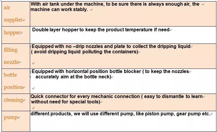 Bu maşın mühərrik yağı, motor yağı, salat, əl yuma geli, hindistan cevizi yağı, soya sousu, susam, şampun, maye sabun, mühərrik yağı kimi qida sənayesində, kimya sənayesində və əmtəə üçün hər cür özlülük / maye üçün xüsusi olaraq hazırlanmışdır. , əyləc yağı, bişirmə yağı, pomidor sousu, içki, efir yağı, bitki yağı, bal, bibər sousu, fıstıq yağı, qatıq, suyu, içki və s. Maye / sousla əlaqəli olan hissə yüksək keyfiyyətli paslanmayan poladdır. Doldurma üçün piston nasosunu qəbul edir. Vəziyyət nasosunu tənzimləyərək, sürətli və yüksək dəqiqliklə bütün qabları bir doldurma maşınında doldura bilər.